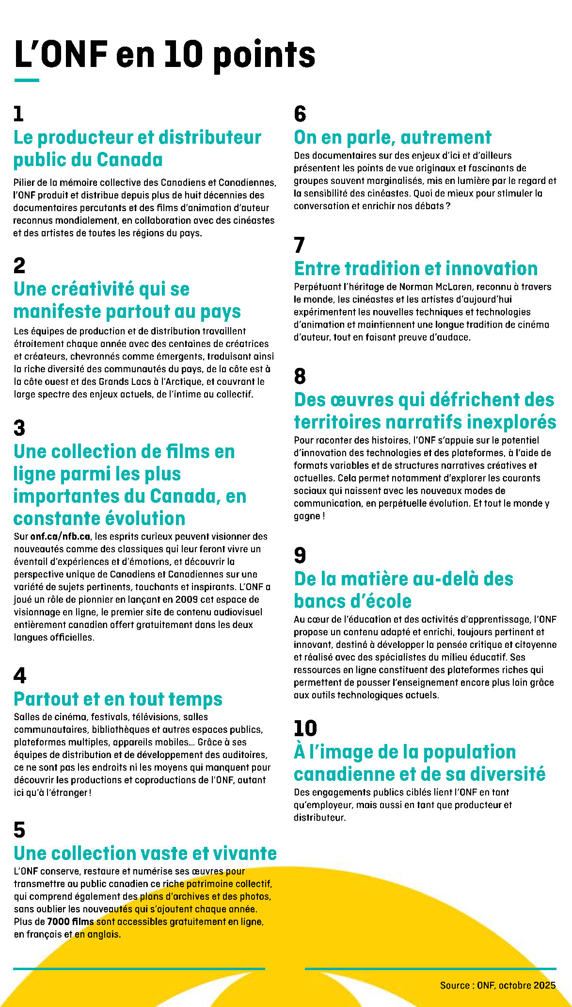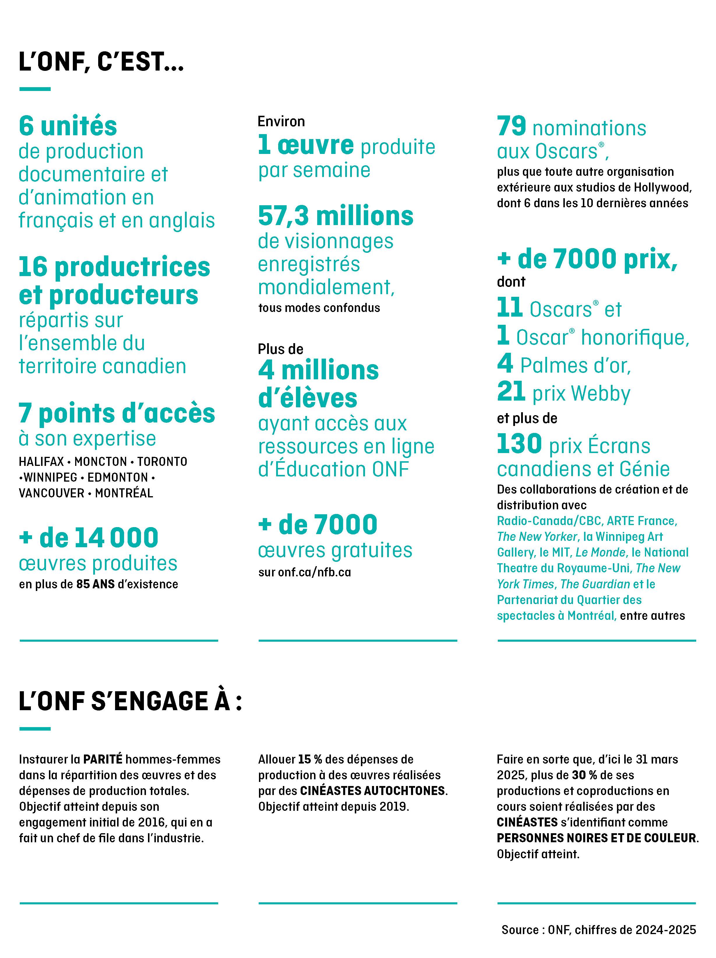 Pilier de la mémoire collective du Canada, créé en 1939, l’ONF est l’un des plus grands laboratoires de création au monde. En tant que producteur et distributeur public de contenu canadien, il est un incubateur de talents et une véritable vitrine du savoir-faire des cinéastes et des artistes du pays. Gardien du patrimoine audiovisuel vivant et accessible des Canadiens et Canadiennes, il conserve, restaure et numérise sa riche collection. L’ONF est également un acteur clé de l’industrie audiovisuelle et l’économie créative du Canada. L’organisme produit ou coproduit plus d’une cinquantaine d’œuvres par année, soit des documentaires engagés et des films d’animation d’exception. Jusqu’à maintenant, plus de 14 000 œuvres ont été produites, dont plus de 7000 sont accessibles gratuitement en ligne sur onf.ca. L’ONF ainsi que ses productions et coproductions ont remporté au-delà de 7000 prix, dont 11 Oscars et un Oscar honorifique récompensant l’excellence de l’organisation dans toutes les sphères de la cinématographie.