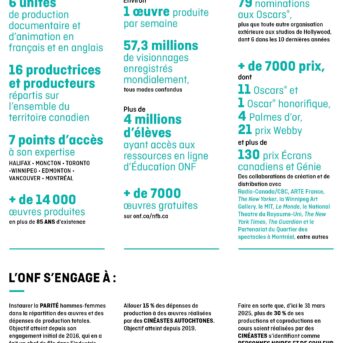 En 2021, l’ONF a formulé ses objectifs et ses engagements en matière d’équité, de diversité et d’inclusion dans un plan visant à susciter des changements durables et notables qui en feront une organisation égalitaire, ouverte et diversifiée. De plus, en 2023, l’ONF s’est engagé à ce que, d’ici le 31 mars 2025, plus de 30 % de ses productions et coproductions en cours soient réalisées par des cinéastes et des artistes s’identifiant comme personnes noires et de couleur.